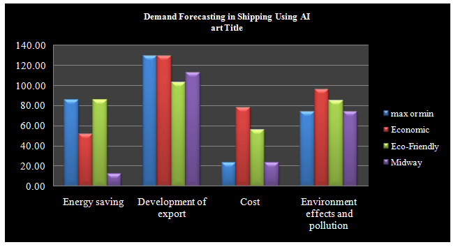 Table 1 presents the Demand forecasting in shipping using AI plays a crucial role in optimizing energy efficiency, reducing costs, and minimizing environmental impact while supporting export growth. The analysis of various factors such as energy saving, export development, cost, and environmental effects highlights the advantages and trade-offs of different approaches. Energy saving is maximized at 86.00, with the eco-friendly strategy matching this value, demonstrating that sustainable practices can significantly reduce energy consumption. The economic approach, however, lags behind at 52.00, indicating that financial optimization does not always align with energy efficiency. The midway approach, scoring only 12.00, suggests that a balanced strategy is less effective in energy conservation. Development of export reaches its peak at 129.53 under both the maximum and economic strategies, signifying that financial-driven decisions enhance trade. The eco-friendly approach, at 102.97, suggests a moderate trade-off, while the midway approach, at 112.58, indicates a balanced export potential. Cost analysis reveals that the economic approach is the most expensive at 78.00, whereas the eco-friendly model costs 56.00. Both the maximum and midway approaches maintain lower costs at 23.00, indicating better affordability. Environmental impact is highest in economic strategies (96.00), whereas eco-friendly solutions (85.00) help mitigate pollution, striking a better balance between sustainability and efficiency.