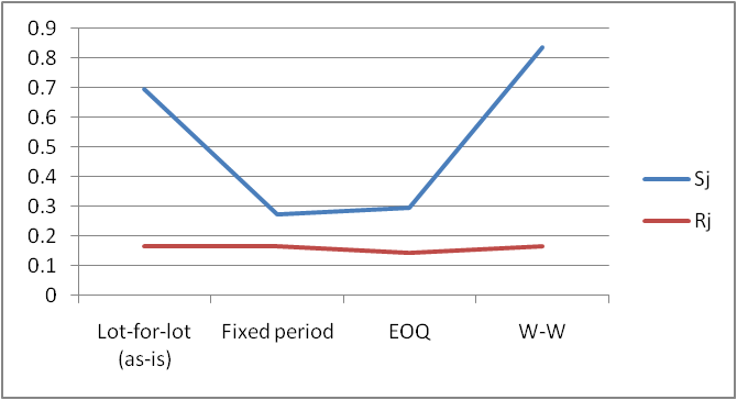 Figure 2 analyzes global supply chain inventory policies using the VIKOR method, focusing on compromise solutions. The Sj metric (sum of estimated deviations) shows that the fixed-term policy (0.272283) performs best overall, closely followed by EOQ (0.294737). The Rj metric (maximum group utilization deviation) favors EOQ (0.142829) for its minimum deviation, while the other policies are at 0.167. The lot-for-lot policy and the W-W policy exhibit higher Sj values (0.695663 and 0.835, respectively), reflecting poorer performance. The results suggest that the fixed-term and EOQ are the optimal choices, with EOQ being the best at minimizing deviation from the best solutions.