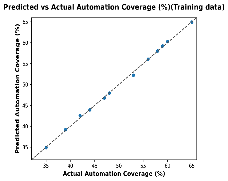 The scatterplot of predicted vs. actual automation coverage (%) for the training data shows an excellent model fit. The points closely align with the diagonal reference line, indicating that the predicted values match the actual automation coverage percentages almost exactly. This strong alignment indicates that the regression model successfully captures the underlying relationships between the input variables and automation coverage. The absence of significant deviations or outliers further confirms the accuracy and consistency of the model during training. The distribution of points in the range of 35-65% shows consistent prediction quality, whether the coverage is low, medium, or high. This high accuracy is also supported by the lowest training error metrics ever observed. The plot highlights the model’s robustness in learning training patterns, setting a reliable foundation for applying it to unseen test data.