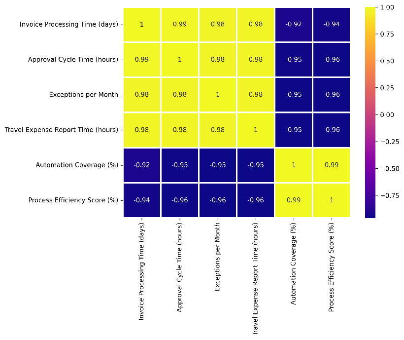 The correlation heat map clearly highlights the strong relationships between process performance variables. Invoice processing time, approval cycle time, exceptions per month, and travel expense report time are all highly positively correlated with each other (r ≈ 0.98–0.99), indicating that delays in one area are consistent with inefficiencies in others. These variables exhibit strong negative correlations with both automation coverage (r ≈ –0.92 to –0.95) and process performance score (r ≈ –0.94 to –0.96), confirming that longer cycle times and more exceptions reduce performance. On the other hand, automation coverage shows a nearly perfect positive correlation with process performance (r = 0.99), reinforcing the important role of automation in driving higher operational efficiency.