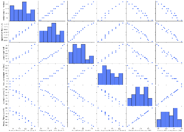 The scatterplot matrix provides a detailed view of the relationships between the six variables in the SAP automation dataset. Strong negative correlations are found between invoice processing time, approval cycle time, exceptions per month, and travel expense report time with the process performance score, indicating that long processing cycles and high exceptions significantly reduce performance. Conversely, automation coverage shows a strong positive relationship with performance, indicating that higher automation adoption directly improves performance outcomes. The scatterplots reveal clear linear patterns, particularly between automation coverage and performance and cycle times and performance, supporting a regression modeling fit. The histograms on the diagonal indicate moderate normal distributions, with little clustering in the automation coverage and performance scores.