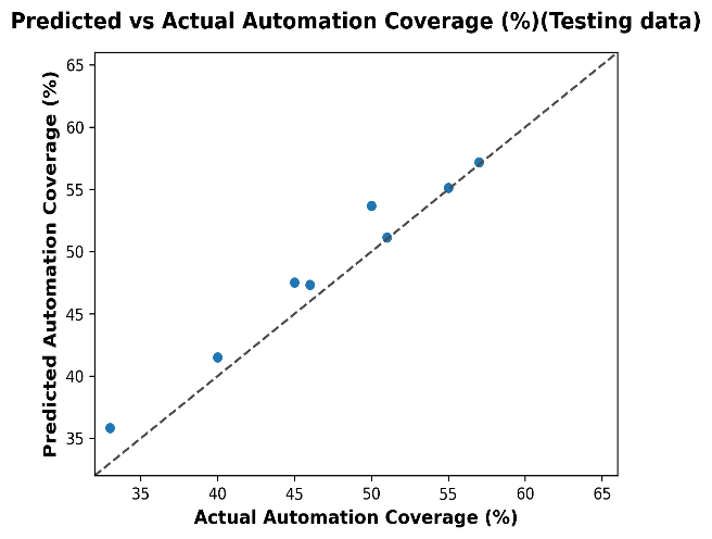 The scatter plot of predicted vs. actual automation coverage (%) for the test dataset illustrates the generalization ability of the model beyond the training data. The points mostly follow the diagonal reference line, indicating a strong predictive relationship, with some deviations visible compared to the almost perfect fit in the training plot. The predictions for mid-range values (around 45–55%) show a slight underestimation, where the predicted coverage falls below the actual values. Nevertheless, the overall alignment is close, demonstrating that the model successfully captures the underlying trend of automation coverage with reasonable accuracy. Importantly, no extreme outliers are observed, and the predictions are within a manageable error range, which is consistent with previous experimental measurements (R² ≈ 0.93, RMSE ≈ 2.01). These results confirm that the model generalizes well, although slightly less accurate than on the training data.